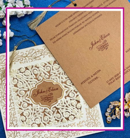 کارت عروسی لاکچری کد 9472 از 3 قسمت کارت چاپی، پاکت و منگوله طلایی تشکیل شده است.مقوای استفاده شده برای تولید این محصول از جنس مقوای کرم لایت وارداتی برای پاکت و مقوای گراف برای تولید کارت چاپی می باشد.در قسمت پاکت ابتدا با استفاده از نوار طلا طرح وکتوری دورتادور کارت چاپ شده است.در وسط پاکت با استفاده از دستگاه لیزر برش های ریزی ایجاد شده است که بین مخمل های ایجاد شده روی پاکت را پر می کند. کارت چاپی درنهایت سادگی تنها دارای پانچی برای عبور منگوله طلایی می باشد.