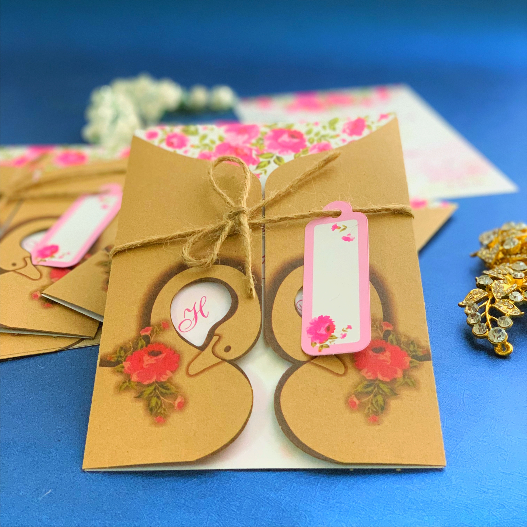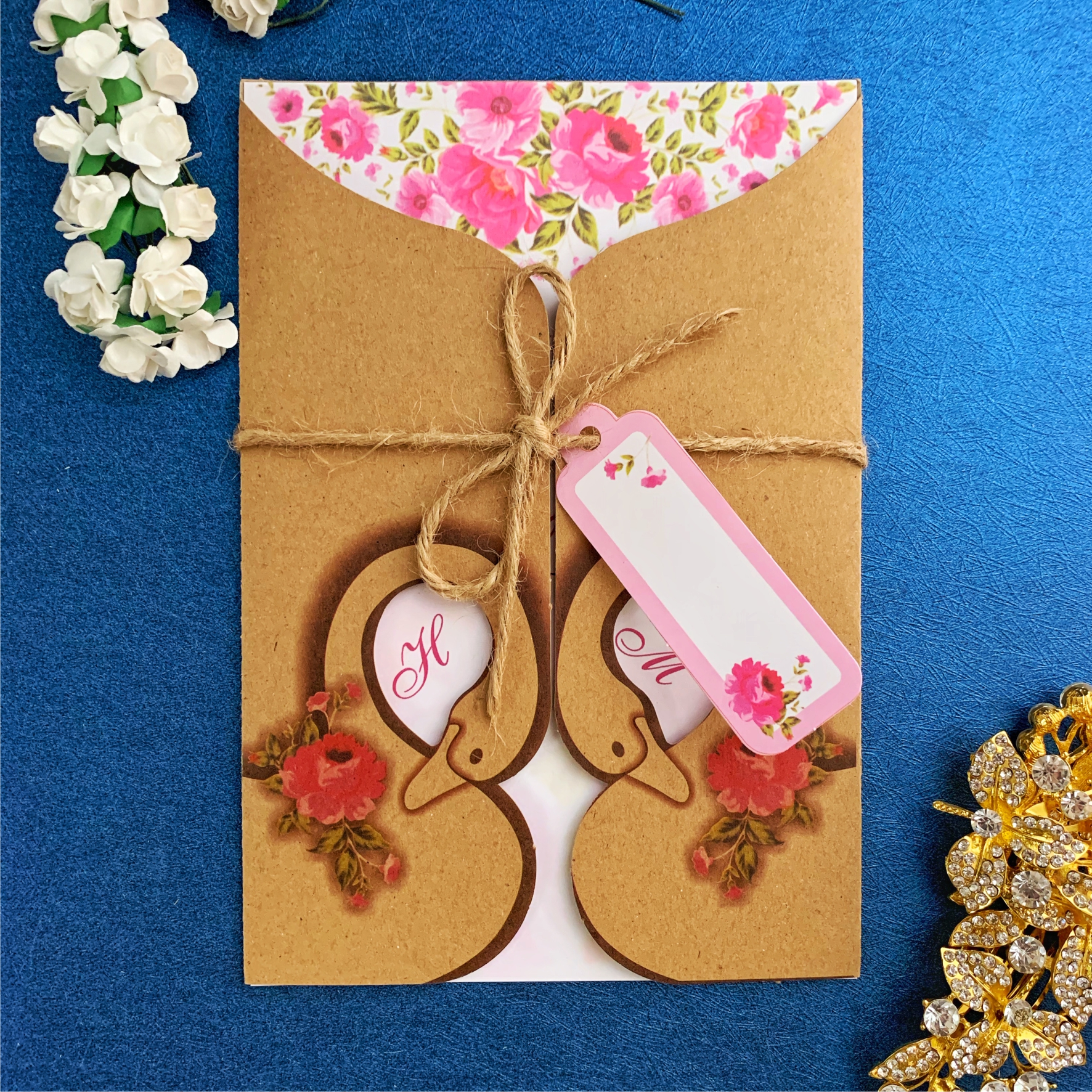 این کارت از چهار قسمت کارت چاپی، رویه ( پاکت )، اتکت و کنف تشکیل شده است. جنس مقواهای استفاده شده در این کارت از نوع مقوای گراف ضخیم و مقوای سفید کارتی ضخیم می باشد. در قسمت رویه کارت نقش دو قوی روبروی هم با چاپ افست ایجاد شده است. دورتادور دو قوی چاپ شده به وسیله قالب برش داده شده که محلی هم برای نمایان شدن اول اسامی لاتین عروس و داماد که روی کارت چاپی چاپ شده است، به وجود می آید. در قسمت کارت چاپی هم زمینه ای از گل چاپ شده است. بر روی اتکتی هم نمایی از گل روی کارت چاپی به همراه زمینه صورتی چاپ شده است. از این اتکیت میتوان برای نوشتن نام مهمان ها استفاده نمود هرچند که پشت پاکت کارت نیز محلی برای این کار در نظر گرفته شده است.
