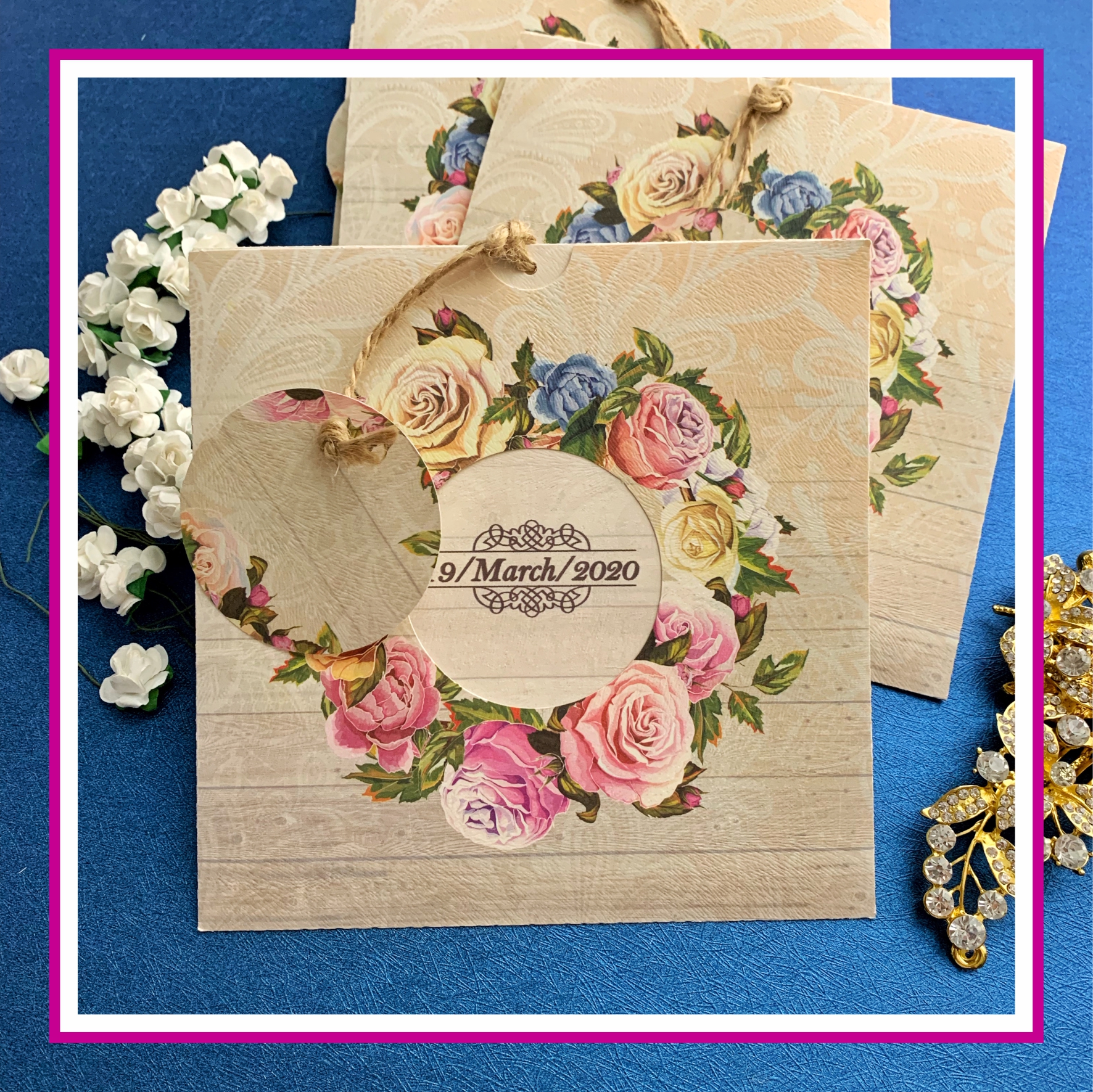 این کارت از سه قسمت رویه گراف ( پاکت ) ، کارت چاپی و اتکت کلید مانند و کنف تشکیل شده است. جنس مقوای این کارت از نوع گراف و کارتی تمپلات شده ضخیم می باشد. در قسمت رویه کارت که همان نقش پاکت کارت را بر عهده دارد نقش دروازه ای با چاپ افست حک شده است و به وسیله قالب دوربری شده تا حالت دروازه حفظ شود. کارت چاپی این کارت هم به وسیله چاپ افست و با طراحی گل تزئین شده است که در قسمت بالای دروازه قرار میگیرد. کنفی که از داخل اتکت کلید مانند عبور میکند و دورتادور کارت گره خورده می شود، نقش بسته نگه داشتن این دروازه را به عهده دارد.