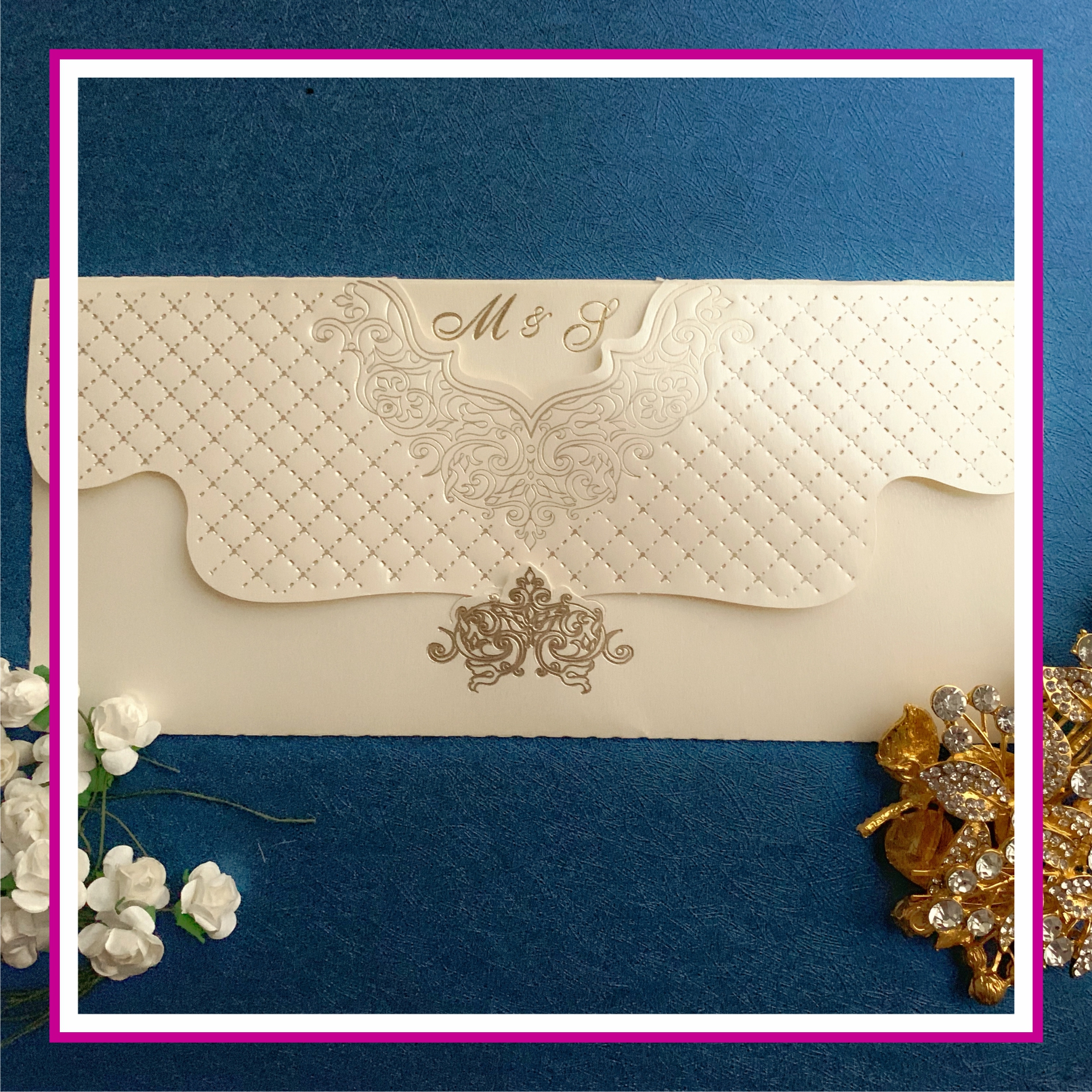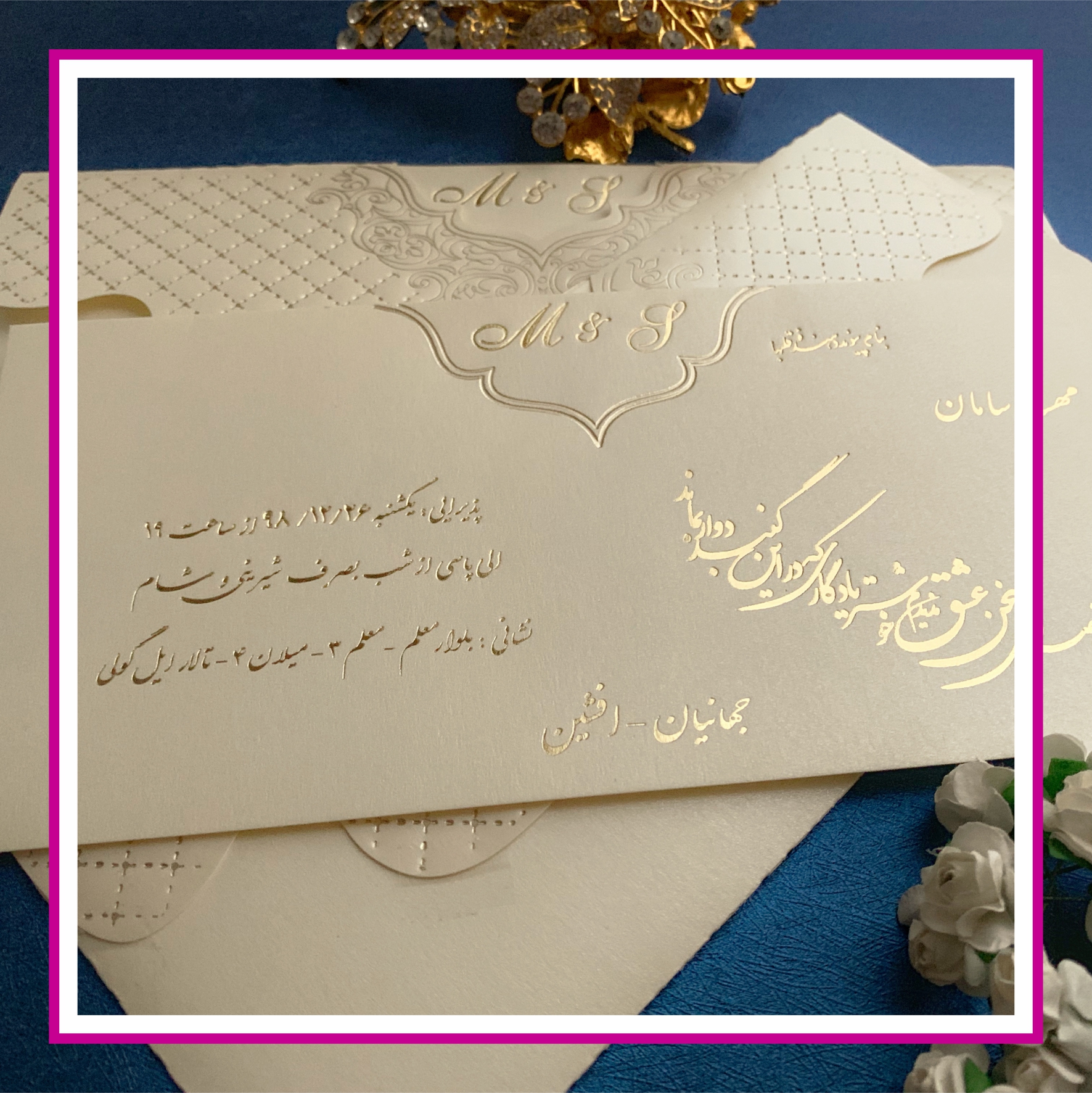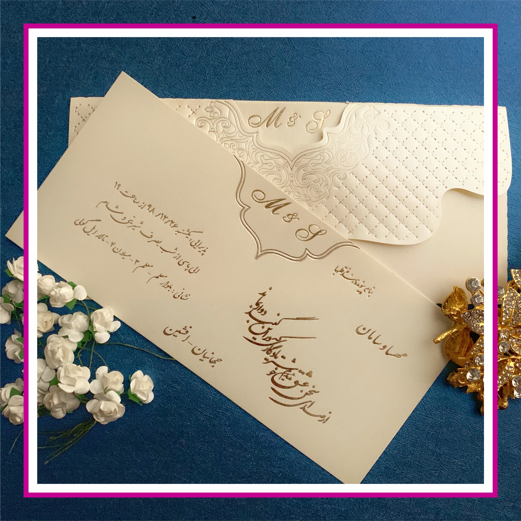 این کارت از دو قسمت کارت چاپی و پاکت تشکیل شده است. مقوای استفاده شده در این کارت از جنس مقوای متالایز کرم ضخیم بوده که جزو مقواهای گران قیمت موجود است. در قسمت درب پاکت،کل زمینه کار به وسیله نوار صدفی پوشش داده شده است. روی چاپ صدف طرحی مشبک با استفاده از نوار طلا برجسته شده است.طراحی این پاکت جلوه کیف های دستی پوست ماری را میتواند در ذهن تداعی کند.طرح وکتوری در قسمت بدنه پاکت با چاپ طلاکوب ایجاد شده است تا با بسته شدن درب پاکت، قفل آن را ایجاد نماید. بالای پاکت قسمتی به وسیله تیغ برش داده شده تا اول اسامی عروس و داماد که روی کارت چاپی چاپ شده اند، در رخ کار نمایش داده شود. کارت چاپی از نوع تک برگ بوده که در قسمت وسط و بالای آن مکانی برای چاپ اول اسامی عروس و داماد به لاتین توسط چاپ طلاکوب ایجاد شده است.
