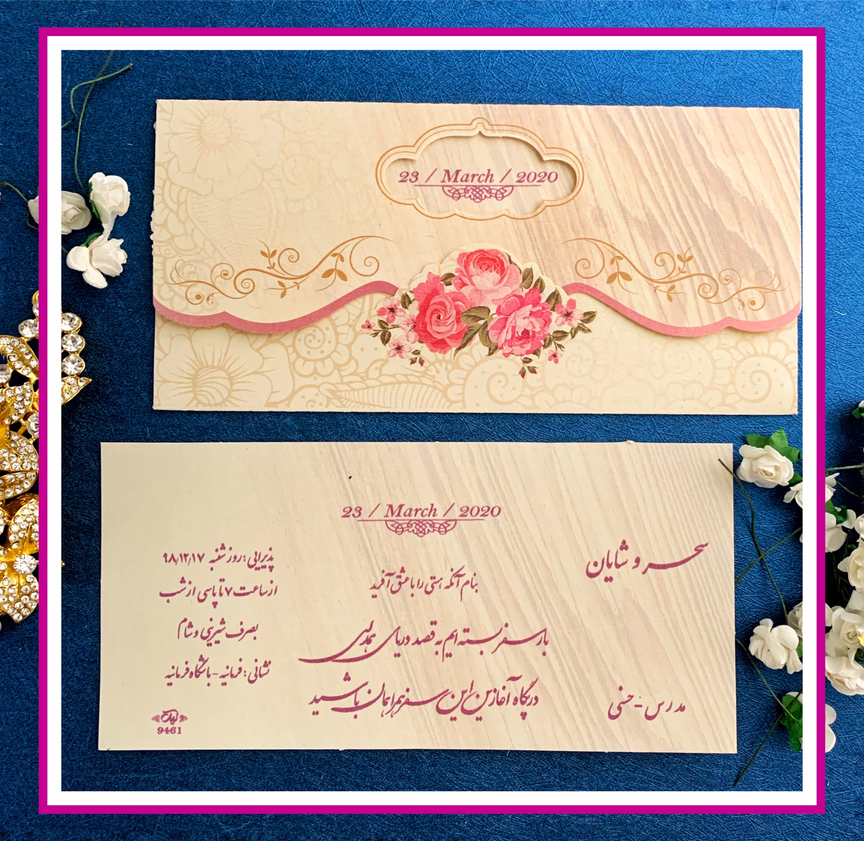 این کارت از دو قسمت کارت چاپی و پاکت تشکیل شده است. برای تولید این محصول از مقوای پارس نسبتا ضخیم استفاده شده است. در قسمت پاکت با بهره گیری از چاپ افست نقش گل هایی لب درب پاکت ایجاد شده است. زمینه پاکت با طرح چوب ترام شده تا جلوه کارت بیشتر شود. پایین پاکت با چاپ وکتوری طلایی رنگ تزئین شده است که بسته شدن درب پاکت همخوانی قابل قبولی را با طرح روی درب پاکت ایجاد می کند. کارت چاپی این محصول با طرح چوب پاکت پر شده تا از خلوت بودن کارت چاپی جلوگیری شود. به طور کلی سادگی مهمترین خاصیت کارت عروسی کد 9461 می باشد.
